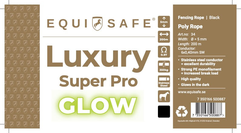 Elrep EquiSafe Luxury 5mm x 200m självlysande. Laddas upp av solen och lyser sedan i mörkret. Detta elrep tillverkas med högsta precision och har mycket hög kvalité. Tack vare 6/st rostfria ledare så har du alltid extra ström i dina hagar för att minimera rymmande hästar.
